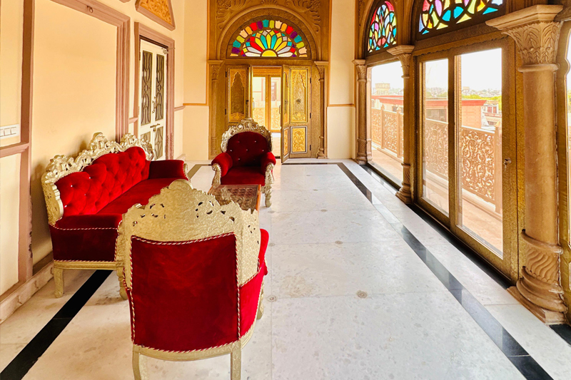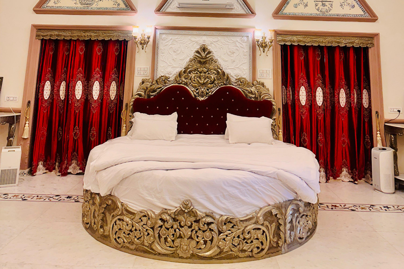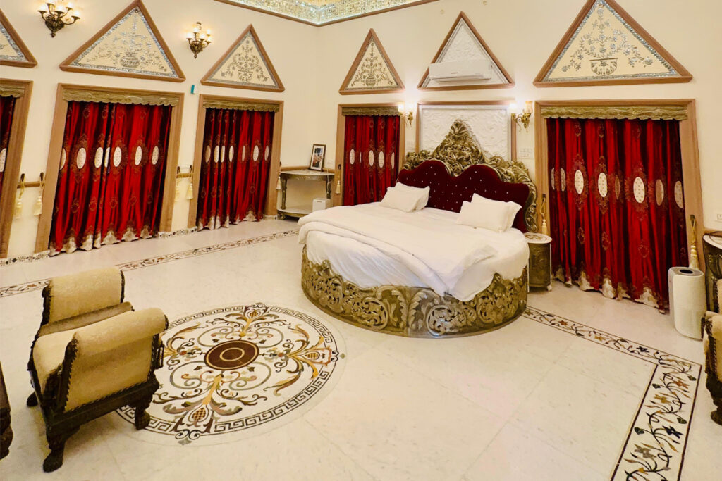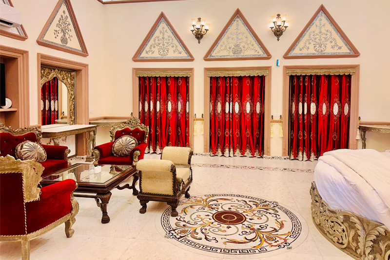 Indulge in the grandeur of the Maharaja sweet at Mahal Khas Palace – a space where royal charm meets modern sophistication. Every corner of the suite is designed to reflect timeless Rajasthani elegance, featuring intricate details, rich textures, and antique furnishings that transport you to a regal era. The suite’s serene ambiance, coupled with personalized services, ensures an unforgettable stay.